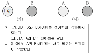 그림 (가)는 동일한 도체구 A와 B를 나타낸 것이다. A는 +Q의 전하로 대전되어 있고 B는 대전되어 있지 않다. 그림 (나)는 (가)의 두 도체구를 접촉시켰다가 다시 처음 위치로 떼어 놓은 것을 나타낸 것이다. 이에 대한 설명으로 보기에서 옳은 것만을 모두 고른 것은?