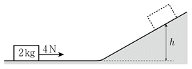 그림과 같이 수평면에 정지해 있던 질량이 2kg인 물체에 수평 방향으로 4N의 힘을 2초 동안 작용하였다. 물체가 수평면을 지나서 경사면을 따라 도달할 수 있는 수평면으로부터의 최대 높이 h[m]는? (단, 수평력이 작용되는 동안 물체는 수평면에 있고, 물체의 크기 및 모든 마찰과 공기 저항은 무시하며, 중력 가속도는 10m/s2이다)