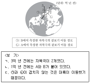 그림은 두 대륙 A와 B에서 측정한 과거 3억 년 전부터 현재까지 자북극의 겉보기 이동 경로를 나타낸 것이다. 이에 대한 설명으로 <보기>에서 옳은 것만을 모두 고르면?