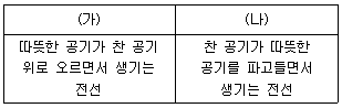 표는 우리나라 A지역을 통과하는 온대 저기압에 동반된 두 전선 (가)와 (나)의 특징을 나타낸 것이다. 이에 대한 설명으로 옳은 것은?