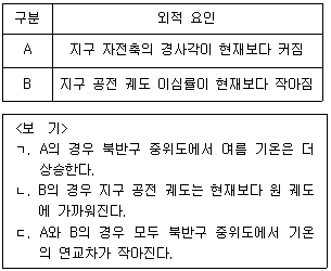 표는 기후 변화를 일으키는 지구 외적 요인 A와 B를 나타낸 것이며, 현재 북반구는 지구가 근일점 부근에 있을 때 겨울철이다. 이에 대한 설명으로 <보기>에서 옳은 것만을 모두 고르면? (단, A와 B 요인 외 다른 요인은 고려하지 않는다)