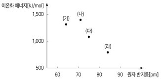 그림은 원자 번호가 연속인 2주기 원소 (가)∼(라)의 원자 반지름과 이온화 에너지를 나타낸 것이다. 이에 대한 설명으로 옳은 것은?