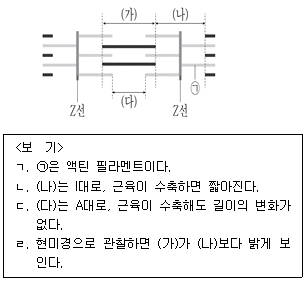 그림은 근육 원섬유의 일부를 나타낸 것이다. ㉠은 액틴 필라멘트와 마이오신 필라멘트 중 하나이고, (가)~(다)는 각각 A대, H대, I대 중 하나이다. 이에 대한 설명으로 <보기>에서 옳은 것만을 모두 고르면?