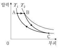 그림은 일정량의 이상 기체의 상태가 A→B→C→A를 따라 변할 때 압력과 부피를 나타낸 것이다. A→B는 등압과정, B→C는 단열과정, C→A는 등온과정이다. 이에 대한 설명으로 옳지 않은 것은? (단, 그림에서 A, B의 온도는 각각 T1, T2이며, 점선은 각각 T1, T2의 등온 곡선이고 T1<T2 이다)