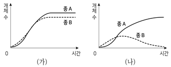 그림 (가)는 종 A와 B를 각각 단독 배양했을 때, (나)는 종 A와 B를 혼합 배양했을 때 시간에 따른 개체 수를 나타낸 것이다. 이 자료에 나타난 군집 내의 상호 작용과 가장 관련이 깊은 것은? (단, (가)와 (나)에서 초기 개체 수와 배양 조건은 동일하다)