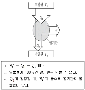 그림은 온도가 T1인 고열원으로부터 Q1의 열을 흡수하여 W의 일을 하고, 온도가 T2인 저열원으로 Q2의 열을 방출하는 열기관을 모식적으로 나타낸 것이다. 이에 대한 설명으로 보기에서 옳은 것만을 모두 고르면?