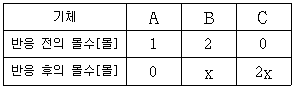 다음은 와 가 반응하여 를 생성하는 반응의 화학 반응식이다. 표는 같은 질량의 와 가 부피가 변할 수 있는 실린더 내에서 반응할 때 반응 전과 후의 몰수를 나타낸 것이다. 이에 대한 설명으로 옳은 것은? (단, 기체의 온도와 압력은 일정하고, 기체는 아보가드로 법칙을 따른다)