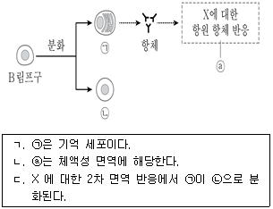 그림은 세균 X가 인체에 침입했을 때 일어나는 방어 작용의 일부를 나타낸 것이다. ㉠과 ㉡은 각각 기억 세포와 형질 세포 중 하나이다. 이에 대한 설명으로 보기에서 옳은 것만을 모두 고르면?