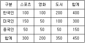 한국, 미국, 중국 세 나라별로 좋아하는 것에 차이가 있는지 다음과 같은 분할표를 활용하여 독립성 검정하고자 할 때 검정 과정 중 잘못된 것은? (문제 오류로 가답안 발표시 1번으로 발표되었지만 확정 답안 발표시 1, 2번이 정답처리 되었습니다. 여기서는 가답안인 1번을 누르면 정답 처리 됩니다.)
