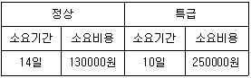 다음 표는 정상상태로 추진되는 작업과 특급상태로 추진되는 작업의 기간과 비용을 나타내고 있다. 비용구배(cost slope)는?