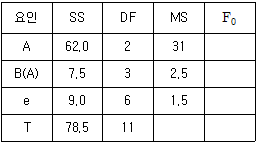 다음은 변량요인 A와 B로 이루어진 지분실험법의 분산분석표이다. 여기서