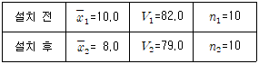 어떤 사무실에 공기청정기를 설치하기 이전과 설치한 이후의 실내 미세먼지에 대한 자료가 다음과 같다. 공기청정기 설치 전과 후의 평균치 차를 검정하기 위한 검정통계량은 약 얼마인가? (단,
