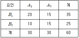다음은 A, B 각 수준조건에서 100개의 물건을 만들어 그 중의 불량품수를 표시한 계수형 2요인 실험의 데이터이다. 오차분산(Ve2)는?