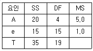 반복수가 같은 1요인 실험에서 다음의 분산분석표를 얻었다.