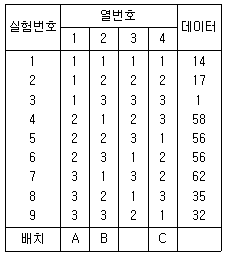다음은 L9(34)형 직교배열표를 이용하여 A, B, C 각각 3수준을 배열하여 실험한 결과를 나타낸 것이다. 요인 A의 제곱한 SA는 약 얼마인가?