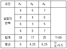 1요인 실험에 의한 다음 데이터에 대하여 분산분석을 할 때, 분산비(F0)의 값은 약 얼마인가?