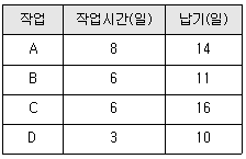 4가지 주문 작업을 1대의 기계에서 처리하고자 한다. 각 작업의 작업시간과 납기가 다음과 같이 주어져 있을 때 여유시간법을 사용하여 작업순서를 결정할 경우, 평균흐름시간은 며칠인가?