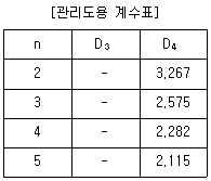 Rs 관리도의 관리상한을 다음의 관리도용 계수표를 사용하여 계산하면 어떻게 되는가? (단,