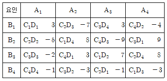 어떤 정유정제공정에서 장치(A)가 4대, 원료(B)가 4종류, 부원료(C)가 4종류, 혼합시간(D)가 4종류인데 이것으로 4×4 그레코라틴방격법 실험을 실시하여 다음 데이터를 얻었다. 총 제곱함 ST는 얼마인가?