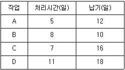 단일 기계에서 대기 중인 4개의 작업을 처리하고자 한다. 최소납기일 규칙에 의해 작업순서를 결정할 경우 4개 작업의 평균처리시간은?