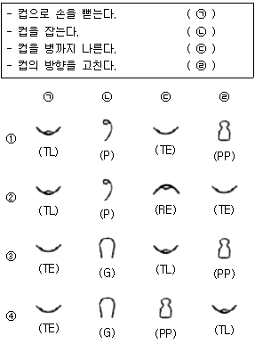 다음은 작은 컵을 손으로 잡고 병에 씌우는 서블릭 동작분석의 일부이다. ( ) 안에 들어갈 서블릭 기호가 바르게 나열된 것은?