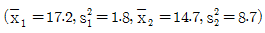 두 개의 모집단 N(μ1, σ12), N(μ2, σ22)에서 H0:μ1=μ2를 검정하기 위하여 n1=10개, n2=9개의 샘플을 구하여 표본평균과 분산으로 각각