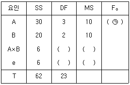 반복이 있는 2요인 실험 혼합모형에서 다음과 같은 분산분석표를 구했다. ( ㉠ )에 들어갈 값은 얼마인가? (단, A는 모수요인, B는 변량요인이다.)