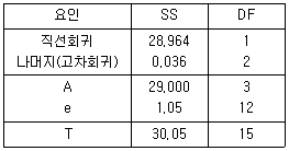 회귀분석 분산분석표에서 나머지 제곱합(Sr)이 유의하지 않았다. 이런 경우 회귀로부터의 제곱합 Suㆍx의 불편분산은 약 얼마인가?