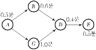 어떤 조립라인 균형 문제의 작업, 선후관계와 과업시간이 그림과 같다. 작업장을 3개로 정할 때 얻을 수 있는 최고의 라인효율은 약 얼마인가?
