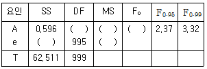 동일한 물건을 생산하는 5대의 기계에서 부적함품 여부의 동일성에 관한 실험을 하였다. 적합품이면 0, 부적합품이면 1의 값을 주기로 하고, 5대의 기계에서 각각 200개씩의 제품을 만들어 부적합품을 만들어 부적합품 여부를 실험하여, 다음과 같은 분산분석표의 일부자료를 얻었다. 기계간의 부적합품 여부를 실험하여, 다음과 같은 분산분석표의 일부자료를 얻었다. 기계간의 부적합품률에 서로 차이가 있는지에 관한 가설검정을 실시했을 때 판정기준으로 맞는 것은?(오류 신고가 접수된 문제입니다. 반드시 정답과 해설을 확인하시기 바랍니다.)