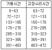 제조공정에 있는 한 기계의 가동시간과 고장 수리시간을 조사하였더니 표와 같았다. 데이터로부터 이 기계의 가용도를 구하면 약 몇 %인가?