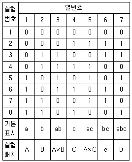 Ls(s7) 직교배열표를 이용하여 관심이 있는 요인효과들의 배치가 표와 같다. 실험번호 3번의 실험조건으로 맞는 것은?