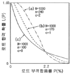 그림의 세 가지 OC 곡선은 모두 2.2%의 부적합품률을 가지는 로트를 합격시킬 확률로 0.10을 갖는 샘플링 계획을 나타낸 것이다. 생산자 위험률이 가장 낮은 것은? (단, N은 로트 크기, n은 샘플 크기, c는 합격판정 개수이다.)