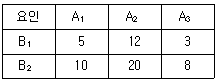 Y제품을 조건 AiBj에서 각각 100회씩 검사한 결과 부적합품이 다음과 같았다. 요인 A의 제곱합(SA)는 약 얼마인가?
