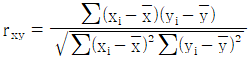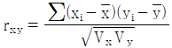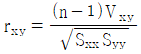 두 변수 x, y에서 x는 독립변수, y는 그에 대한 종속변수이고 대응을 이루고 있는 표본이 n개 일 때, 이들 사이의 상관관계를 분석하는 수식으로 틀린 것은? (단, 확률변수 X의 제곱합(Sxx), 확률변수 Y의 제곱합(Syy), 공분산(Vxy), X의 분산 (Vx), Y의 분산(Vy), n은 표본의 수이다.)