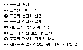 사내표준화의 추진방법으로 경영방침으로서 사내표준화 실시의 명시 후의 순서로 맞는 것은?