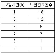 다음은 어떤 전자장치의 보전시간을 집계한 표이다. MTTR의 추정치는 약 몇 시간인가?