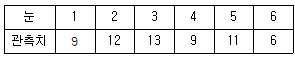 다음 표는 주사위를 60회 던져서 1부터 6까지의 눈이 몇 회 나타나는가를 기록한 것이다. 이 주사위에 관한 적합도 검정을 하고자 할 때, 검정통계량