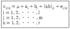 모수요인 A와 변향요인 B의 수준이 각각 과 이고, 반복수가 일 경우의 모형은 다음과 같다. 분산분석을 통해 A 요인의 수준 간 차이가 있는지를 검정하고자 한다. 이를 위해 F 분포를 이용하고자 하는 경우, 분모의 자유도는 얼마인가?