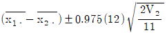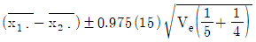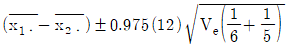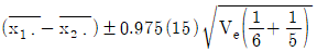 모수요인을 갖는 1요인 실험에서 수준 1에서는 6번, 수준 2에서는 5번, 수준 3에서는 4번의 반복을 통해 특성치를 수집하였다. μ1-μ2의 95% 양측 신뢰구간 식은?