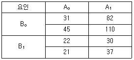 다음의 표는 반복이 2회인 22형 요인실험이다. 요인 A와 B의 상호작용의 효과는?