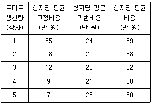 다음은 어느 토마토 농가의 평균비용을 나타낸 표이다. 이 농가의 고정비용은 35만 원이며 토마토의 시장가격이 한 상자에 15만 원일 때, 이윤을 극대화하는 생산량(상자)은? (단, 토마토는 완전경쟁시장에서 판매되고 있다)