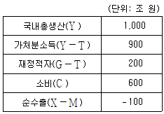 다음 국민소득계정 자료에 기초할 때, 이 경제의 투자(I) 규모는? (단, T는 조세, G는 정부지출, X는 수출, M은 수입이다)