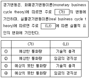 13 정부가 정부지출 수준의 변화 없이 조세징수액을 줄이고, 그 대신 동일액의 국채를 발행하여 재원을 충당하였다. 이에 대한 리카디언 등가정리(Ricardian equivalence theorem)의 설명으로 옳지 않은 것은? (단, 초기에 경제는 장기 균형상태에 있다) 14 (가), (나)에 들어갈 말을 바르게 연결한 것은? 15 대부자금 시장의 수요는 투자로 구성되고, 공급은 민간저축과 정부저축(조세수입-정부지출)의 합으로 구성된다. 대부자금 시장에서 재정적자를 통해 정부지출을 증가시키는 경우, 이에 대한 설명으로 옳지 않은 것은? (단, 대부자금 수요곡선과 공급곡선은 각각 실질이자율에 대해 우하향, 우상향하고, 초기에 정부는 균형재정상태에 있다) 16 Q(L ,K)=LαKβ인 콥-더글라스(Cobb-Douglas) 생산함수에 대한 설명으로 옳은 것은? (단, Q, L, K는 각각 생산량, 노동량, 자본량을 나타내며, α>0, β>0 이다) 17 동질적 재화를 생산하는 기업 A와 B는 꾸르노(Cournot) 경쟁을 하고 있다. 이 복점시장의 역수요함수는 P=90-Q 이고, 두 기업의 비용함수는 각각 CA(qA)=10qA와 CB(qB)=20qB 이다. 꾸르노 모형의 균형에서 기업 A와 B의 생산량을 바르게 연결한 것은? (단, P는 시장가격, Q는 Q=qA+qB인 시장생산량이고, qA와 qB는 각각 기업 A와 B의 생산량이다) 18 기업 A와 B는 자신의 생산량 결정에 있어서 대량 생산(H)과 소량 생산(L) 중 하나를 선택할 수 있다. 두 기업이 동시에 생산량을 한 번만 선택하는 게임의 보수행렬이 다음과 같을 때, 이 게임에 대한 설명으로 옳지 않은 것은? (단, 보수행렬의 괄호 안 첫 번째 숫자는 기업 A의 보수이고, 두 번째 숫자는 기업 B의 보수를 나타낸다) 19 일인당 생산함수가 y=k1/2=인 솔로우(Solow) 성장모형에서, 저축률과 감가상각률은 각각 40%와 20%이다. 이 경제의 균제상태에 대한 설명으로 옳지 않은 것은? (단, y와 k는 각각 일인당 생산량과 일인당 자본량이며, 인구증가와 기술진보는 없다) 20 어느 경제의 본원통화가 600억 원, (법정지급준비금/요구불예금) 비율이 0.1, (현금/요구불예금) 비율이 0.5인 경우 통화승수와 통화량을 바르게 연결한 것은? (단, 민간은 현금 보유 외 나머지는 모두 요구불예금으로 저축하고, 은행은 법정지급준비금을 제외한 모든 예금을 대출한다)