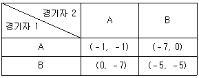 다음 표는 경기자 1과 경기자 2의 전략 A와 전략 B의 선택에 따른 두 경기자의 보수(payoff)를 나타낸 것이다. 두 경기자가 전략을 동시에 선택할 때, 내쉬균형(Nash equilibrium) 전략은? (단, 표의 괄호에서 앞의 숫자는 경기자 1의 보수, 뒤의 숫자는 경기자 2의 보수이다)