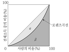 그림은 소득분배상태를 나타내는 로렌츠곡선(Lorenz curve)이다. 이에 대한 설명으로 옳지 않은 것은?