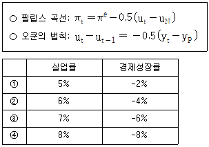 실업률 3%(자연실업률), 경제성장률 2%(잠재성장률), 인플레이션율 5%인 폐쇄경제에서, 인플레이션율이 높다고 판단한 통화당국이 긴축정책을 시행하자 인플레이션율이 3%로 낮아졌다. 이 경제가 다음의 필립스 곡선과 오쿤의 법칙을 따르며 자연실업률, 잠재성장률, 기대인플레이션율에 아무런 변화가 없다고 가정할 때, 실업률과 경제성장률은? (단, πt는 현재 인플레이션율, πe는 기대인플레이션율, ut는 현재 실업률, uN은 자연실업률, yt는 현재 경제성장률, yP는 잠재성장률이다)