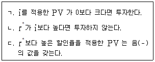 정부가 어떤 공공투자사업을 계획하고 있다. 사업 추진으로부터 예상되는 순편익의 현재가치의 합을 PV라고 하자. 여기서 순편익이란 사업기간 동안 매 기에 발생하는 편익으로부터 비용을 뺀 값이다. 이 사업의 투자 비용을 조달하는 이자율은 i이며, PV를 0으로 만드는 할인율은