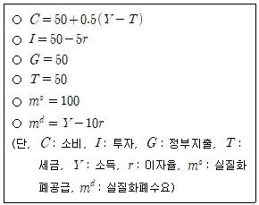 다음과 같이 어느 폐쇄경제의 기본 정보가 주어졌다고 할 때, 재화시장과 화폐시장의 균형을 동시에 달성하는 소득은?