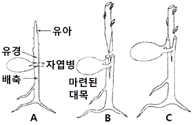 대목을 대립종자의 유경이나 유근을 사용하여 접목하는 방법으로 접목한 뒤에는 관계습도를 높게 유지하며, 정식 후 근두암종병의 발병율이 높은 단점을 갖는 접목법은?